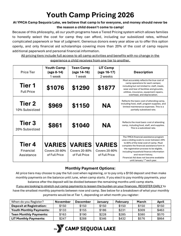Financial Assistance – Please select this option to apply for financial assistance. The YMCA financial assistance program uses a sliding scale to cover up to 80% of the total cost of camp. Please complete the financial assistance form in the registration process to be eligible.